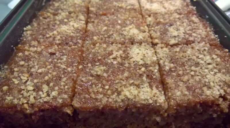 Ovaj brz,starinski kolac izuzetnog ukusa mozete napraviti od sastojaka koje uglavnom imate.Umesto seckanih oraha mozete ubaciti suvo grozdje ili neko drugo suvo voce.Mozete posuti orasima ili kokosom.I mlevena cokolada se odlicno slaze sa ukusima.