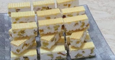 Izliti masu u dublji lim za pečenje premazan maslacem i posut krušnim mrvicama. Peći u zagrijanoj pećnici na 175*C 20 minuta, zatim pojačati temperaturu na 190*C i peći dok ne poprimi lijepu rumenu boju. Dobro rashladiti, rezati na kocke i poslužiti uz šalicu mlijeka ili čaja.