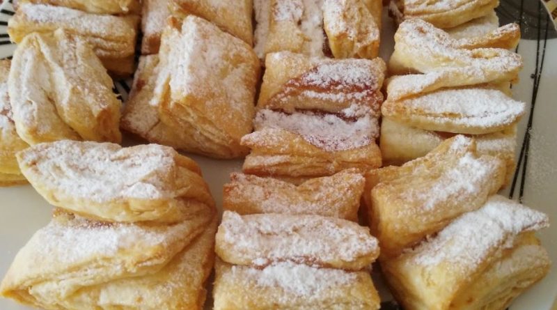 Kad je treći put namazano i odmaralo razviti ga što tanje i seći po želji ( ja sam sekla pravougaonike) stavljati džem presaviti i pritisnuti prstom ispod džema malo da džem ne iscuri.