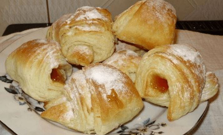 Ostaviti da miruje 1/2 sata. Sve ponoviti još dva puta. Nakon toga razvaljati, rezati na trokute, na svaki trokut staviti malo marmelade, zaviti i ostaviti kifle da narastu pa staviti peći na 200 stupnjeva. Pečene posuti šećerom u prahu.