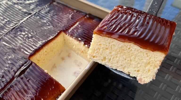 Kada se testo ispeče, ostavite da “odmori” pet minuta i izboskajte ga čačkalicom. Zatim ga prelijte i preko toga premažite karamelom.